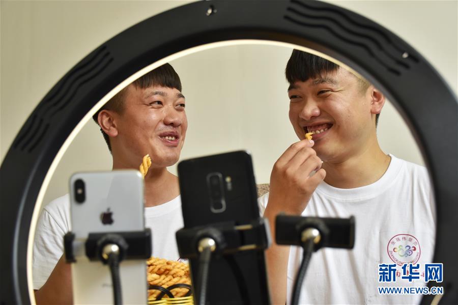 7月8日,张亚博(左)、张亚钊兄弟在直播带货。新华社记者韩朝阳摄