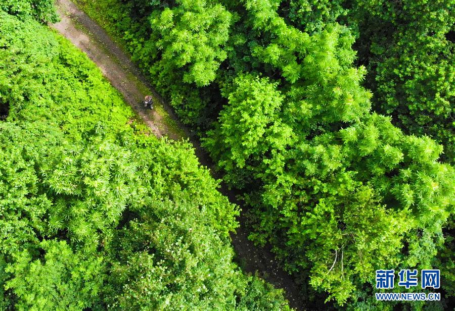 7月8日,董红雨在迎春林业局有限公司施业区内进行野生东北虎信息搜集和巡护工作(无人机照片)。新华社记者王松摄