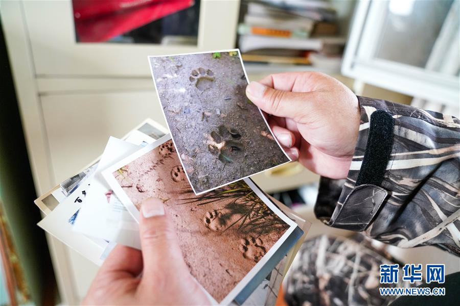 董红雨在家中向记者展示自己拍摄的野生东北虎足迹照片(7月8日摄)。新华社记者王松摄