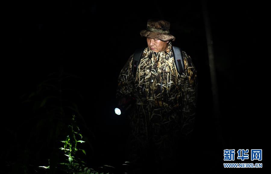 董红雨在迎春林业局有限公司施业区内进行野生东北虎信息搜集和夜巡工作(7月8日摄)。新华社记者王松摄