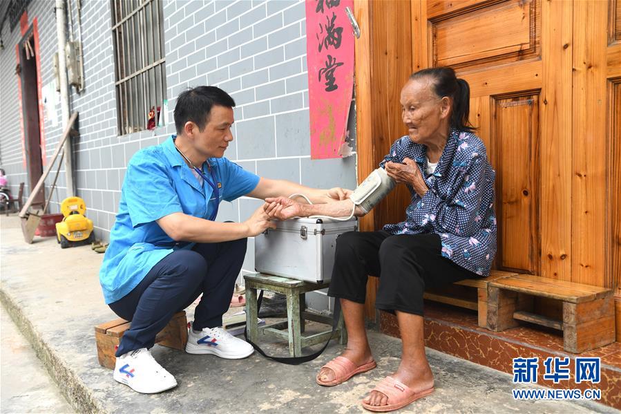 7月8日,在长垌村出诊的陶雷(左)给一名瑶族群众测量血压。新华社记者周华摄