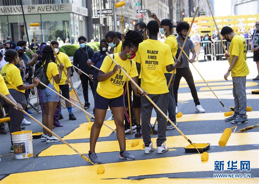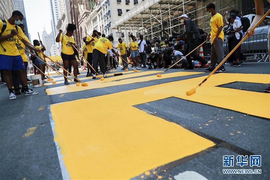 7月9日,在美国纽约第五大道特朗普大厦前,人们涂写“黑人的命也是命”标语。当天,数十人在纽约第五大道特朗普大厦前的路面上涂写“黑人的命也是命”标语。纽约市计划在多处地点涂写“黑人的命也是命”标语。新华社记者王迎摄