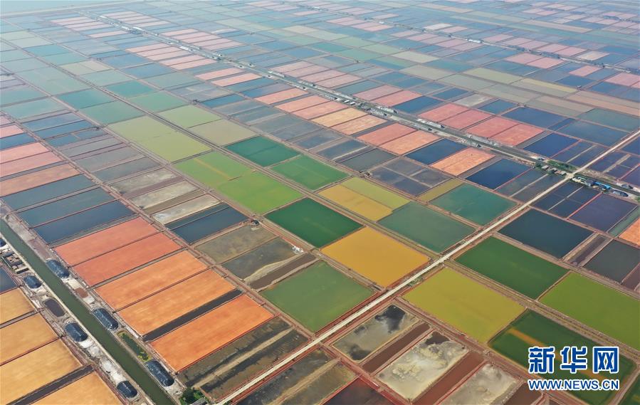 7月9日拍摄的唐山市曹妃甸区南堡盐场盐田(无人机照片)。在我国长芦盐区海盐生产基地之一的河北省唐山市曹妃甸区南堡盐场,一年一度的春盐收获工作即将结束,今年南堡盐场的春盐产量预计可达72万吨。新华社记者杨世尧摄