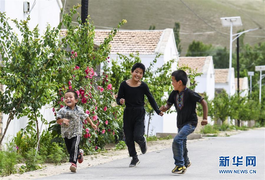 在新疆特克斯县境内的牧民定居点,小朋友在巷道内追逐玩耍(7月6日摄)。新华社记者王菲摄