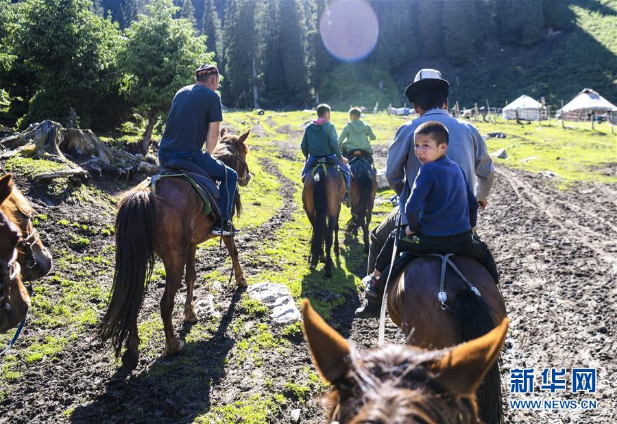 在新疆特克斯县境内的夏牧场里,小朋友跟随家人一起放牧(6月30日摄)。新华社记者王菲摄