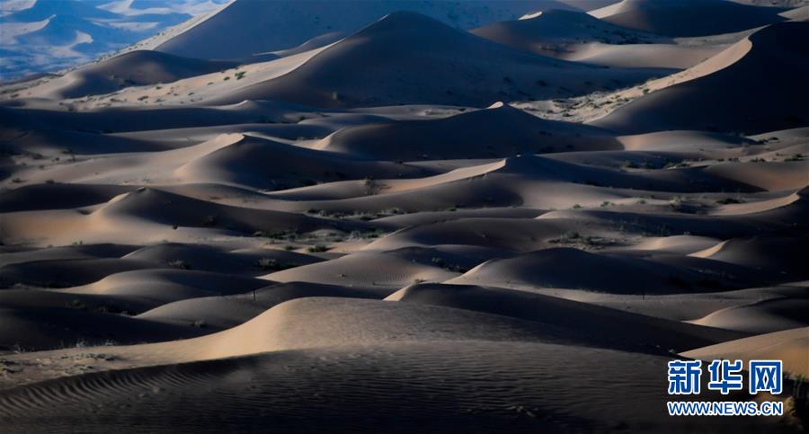 这是7月8日拍摄的腾格里沙漠风光。位于内蒙古自治区阿拉善左旗西南部和甘肃省中部边境的腾格里沙漠是我国第四大沙漠,总面积约为4.3万平方公里。夏日傍晚,腾格里沙漠连绵的沙丘被日光勾勒出美丽的线条,美不胜收。新华社记者连振摄