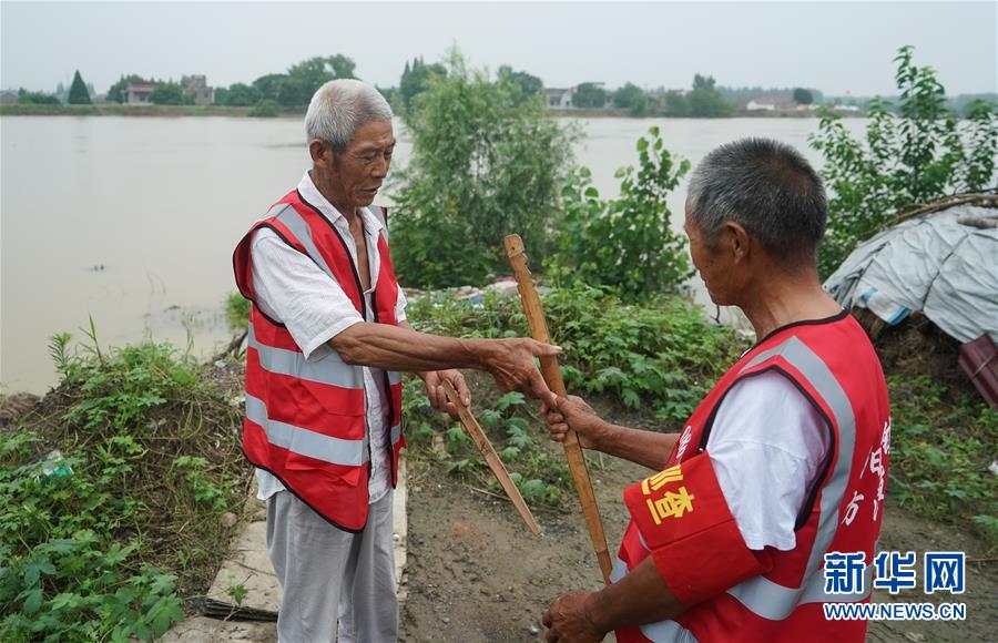 7月9日,在高淳区阳江镇永丰圩,巡堤员在进行“水牌”(巡堤查险责任牌)交接。新华社记者季春鹏摄