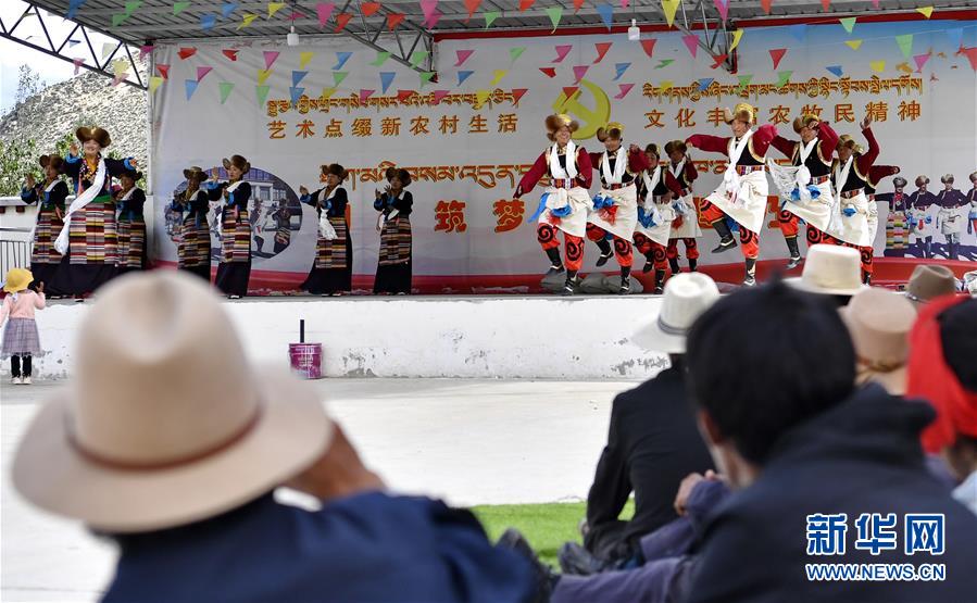 山南市扎囊县桑耶镇乃卡村村民观看文艺演出队的表演(7月7日摄)。西藏自治区山南市为弘扬民族文化,加强村居精神文明建设,组建了560余个行政村文艺演出队。演员来自百姓,服务百姓,一年四季都有演出,丰富了百姓的文化生活。新华社记者张汝锋摄