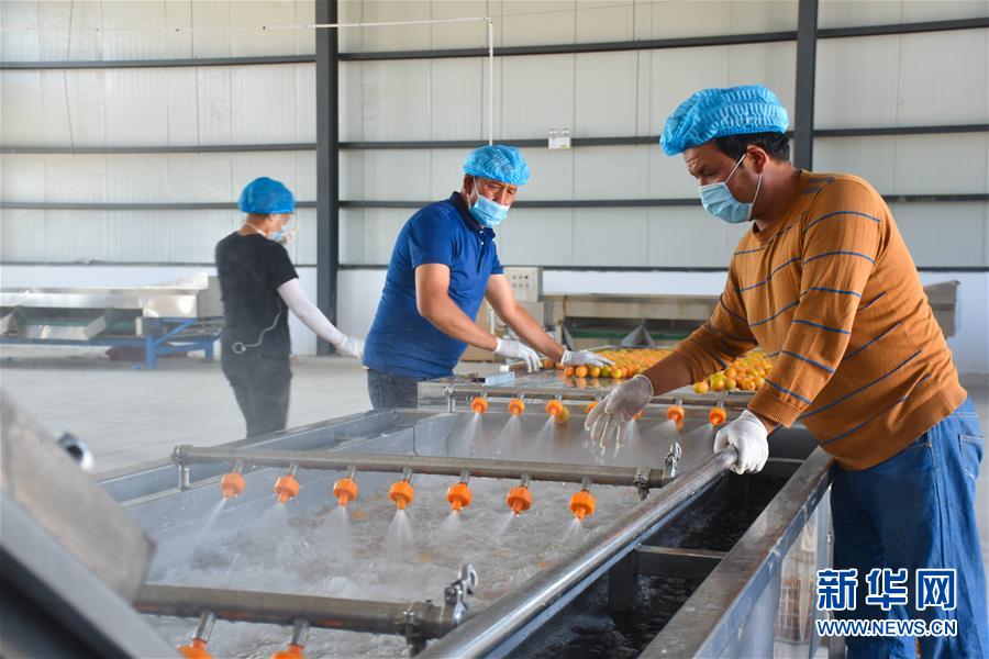 在新疆英吉沙县一家合作社内,员工在清洗杏子(7月2日摄)。新华社记者高晗摄