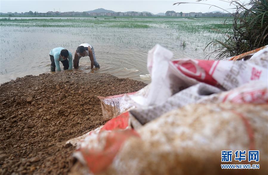 7月9日,邵忠如(右)和村民用沙袋封堵圩堤上的泡泉。新华社记者万象摄