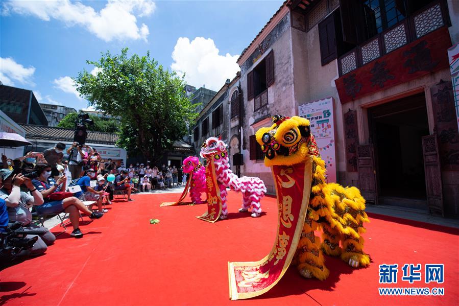 7月11日,演员在“庆祝澳门历史城区申遗成功15周年嘉年华”上表演舞狮。新华社记者张金加摄