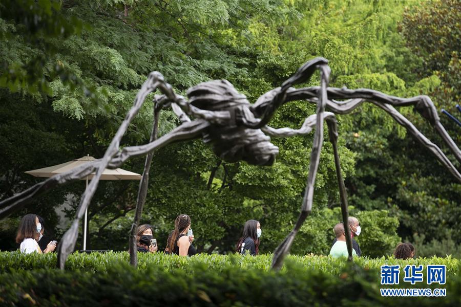 7月11日,在美国华盛顿,人们戴着口罩在国家艺术画廊雕塑公园游览。新华社记者刘杰摄