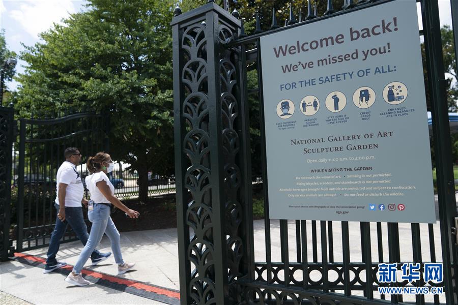 7月11日,人们在美国华盛顿国家艺术画廊雕塑公园游览时经过门口关于疫情防控的告示。新华社记者刘杰摄