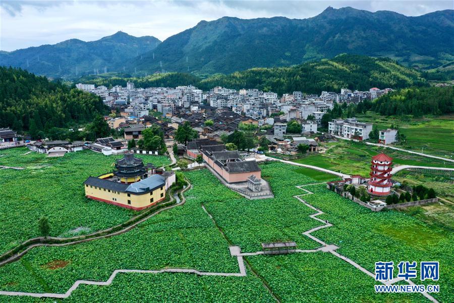 7月3日,浦源村鲤鱼溪公园内荷花盛开,吸引游人前来观赏(无人机照片)。新华社记者 姜克红 摄