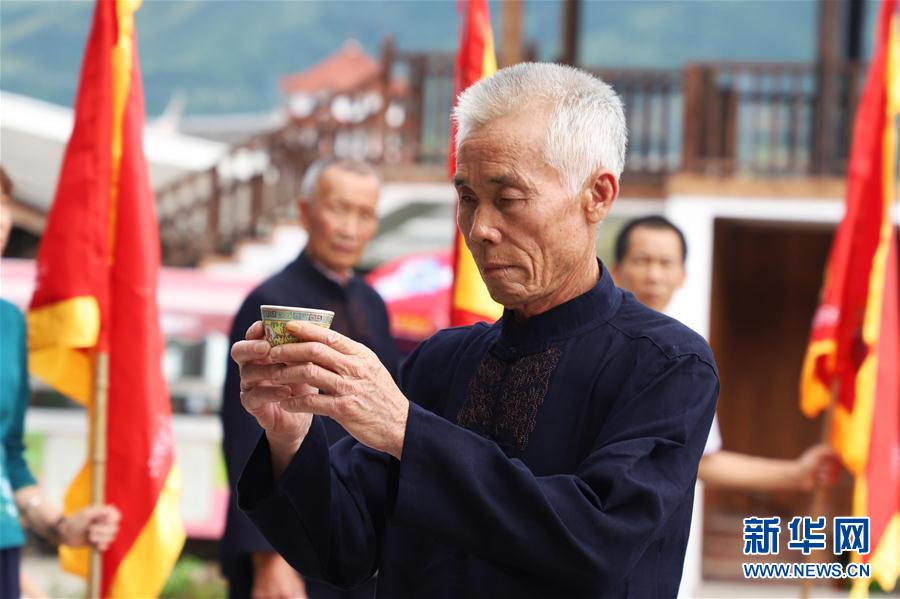 7月4日,浦源村民展示鱼祭习俗。鱼祭习俗是为死去的鲤鱼举行送葬仪式,是浦源村特有的习俗。新华社记者 姜克红 摄