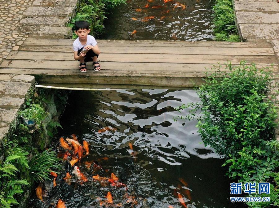 7月3日,一名男孩在浦源村鲤鱼溪畔喂食溪中的鲤鱼。新华社记者 姜克红 摄
