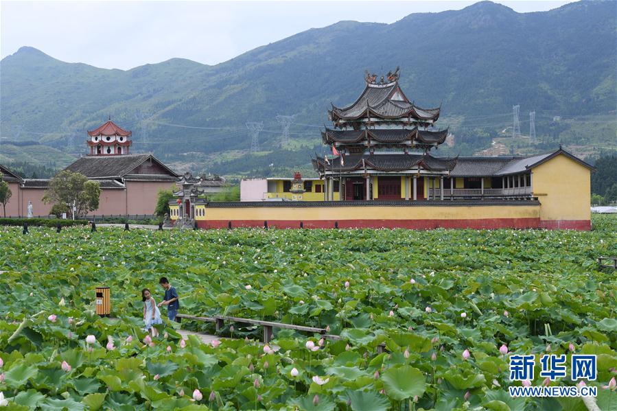 7月3日,浦源村鲤鱼溪公园内荷花盛开,吸引游人前来观赏(无人机照片)。新华社记者 姜克红 摄