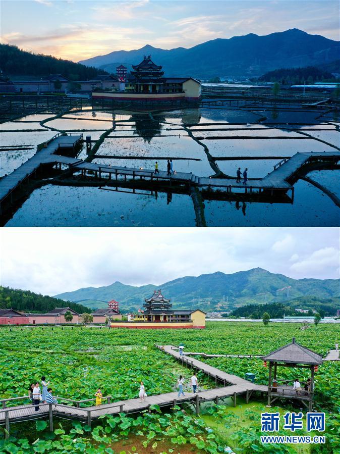 拼版照片:人们在浦源村鲤鱼溪公园内游览(上图为4月17日拍摄;下图为7月3日拍摄)。新华社记者 姜克红 摄
