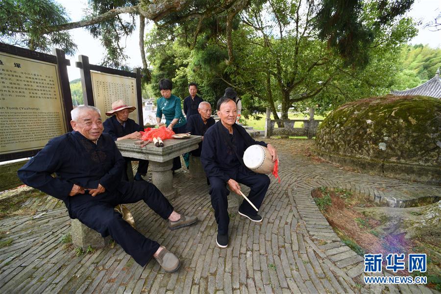 7月4日,几名参加鱼祭习俗展示的浦源村民在树荫下休息。鱼祭习俗是为死去的鲤鱼举行送葬仪式,是浦源村特有的习俗。新华社记者 姜克红 摄