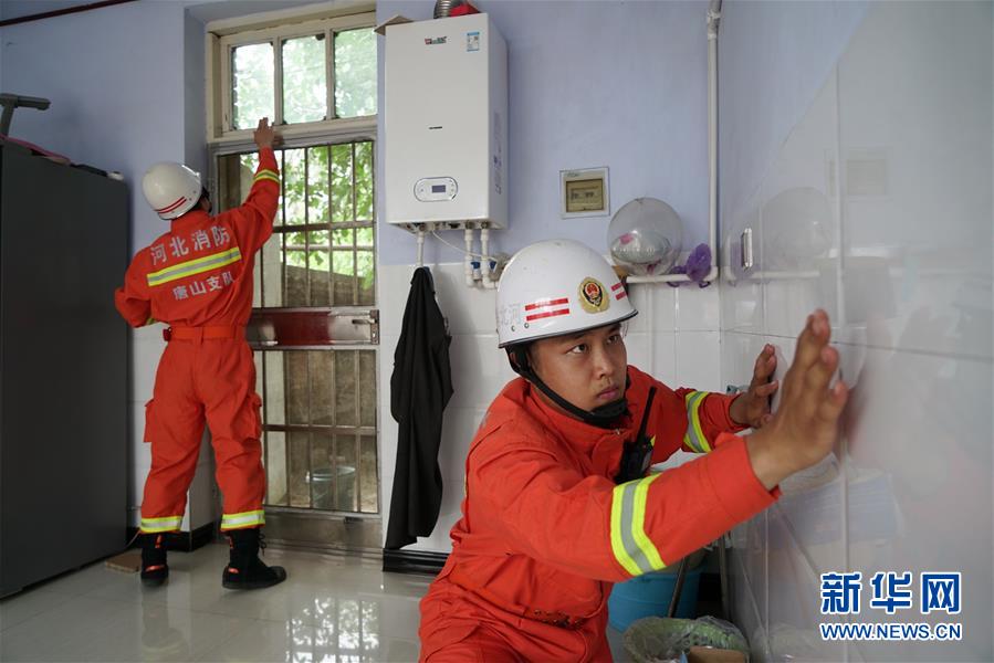 7月12日,消防救援人员在河北省唐山市古冶区卑家店镇前巍峰山村村民家中排查。新华社记者 牟宇 摄