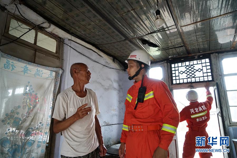 7月12日,消防救援人员在河北省唐山市古冶区卑家店镇前巍峰山村村民家中向村民了解情况。新华社记者 牟宇 摄