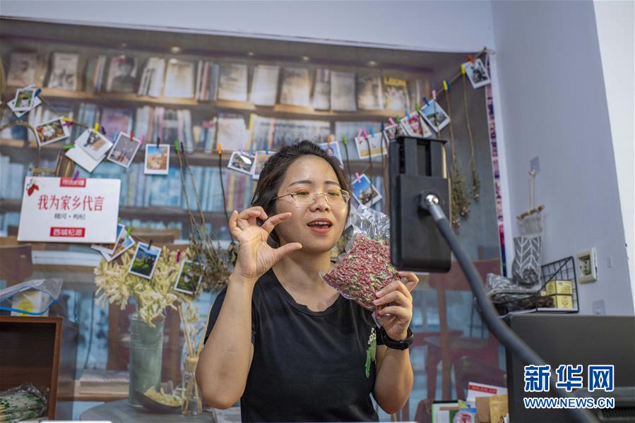 在位于新疆精河县城的工作室内,朱虹美通过手机向网友介绍真空包装的枸杞产品(7月11日摄)。新华社记者 胡虎虎 摄
