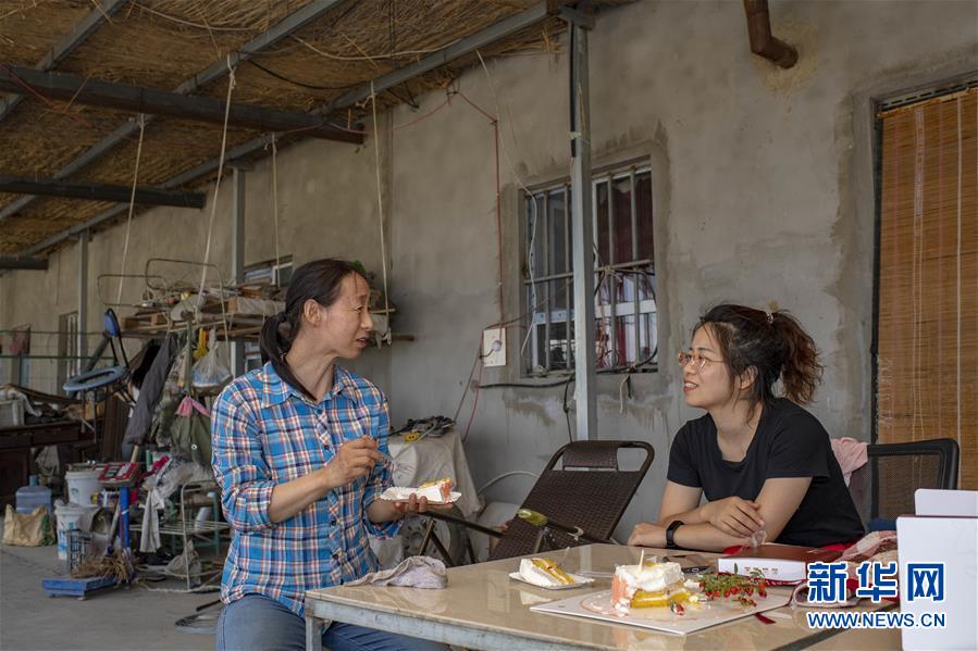 在新疆精河县城近郊,朱虹美(右)与合作的杞农陈克琴在交流(7月11日摄)。新华社记者 胡虎虎 摄