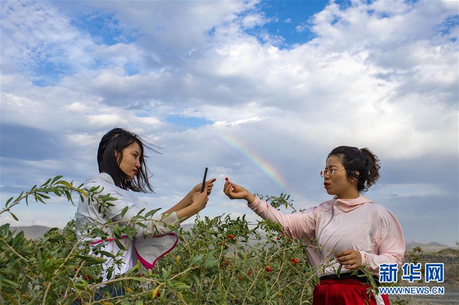 在新疆精河县城近郊的一处枸杞园,朱虹美(右)和助手李红英在拍摄视频,向网友介绍待采收的枸杞(7月11日摄)。新华社记者 胡虎虎 摄