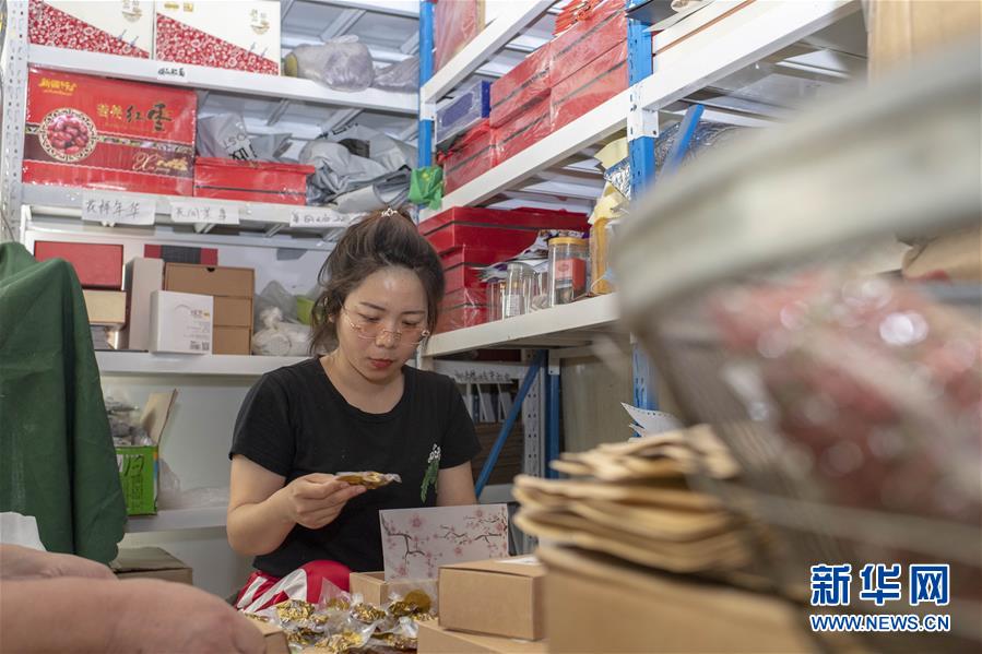 在位于新疆精河县城的工作室内,朱虹美按网友订单打包干果产品(7月11日摄)。新华社记者 胡虎虎 摄