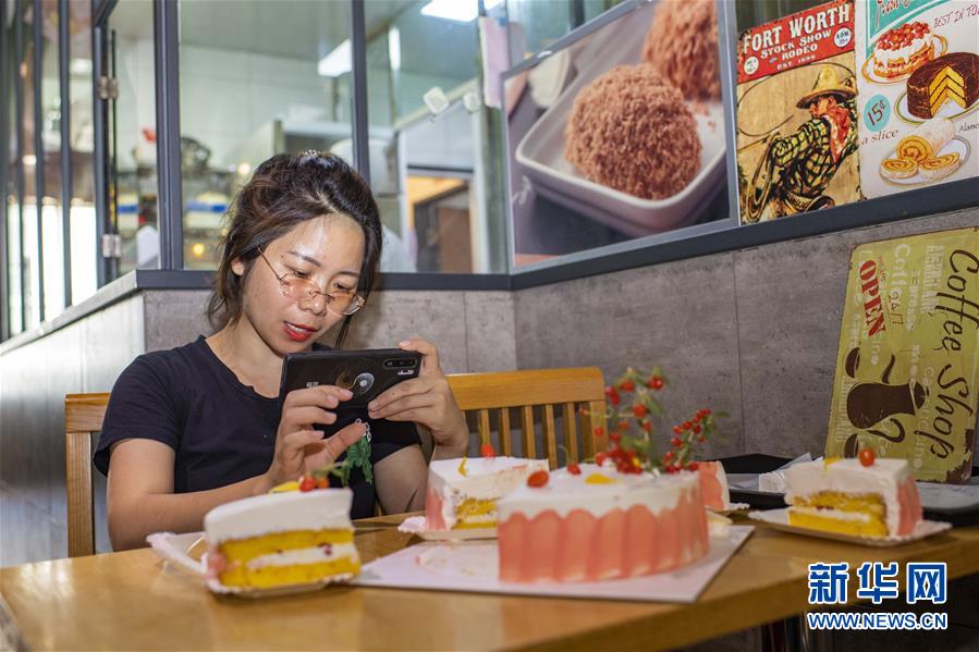 在位于新疆精河县城的一家糕点店,朱虹美在录制视频,介绍创意食品——由枸杞果酱、鲜枸杞制作的“枸杞蛋糕”(7月11日摄)。朱虹美计划联合精河其他行业,一起推广枸杞。新华社记者 胡虎虎 摄