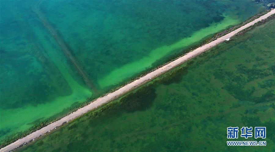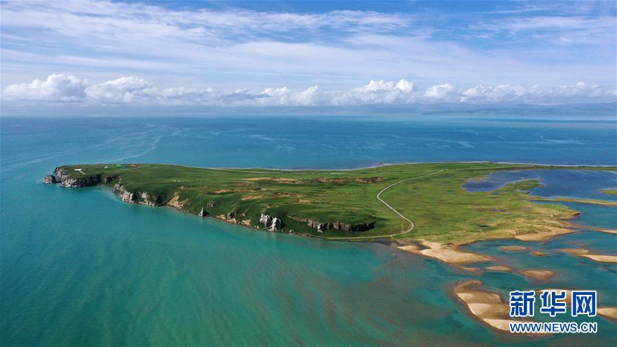 7月10日拍摄的青海湖风光(无人机照片)。盛夏时节,被誉为“中国最美湖泊”的青海湖畔景色宜人,蓝天、白云、湖水与草原组成一幅壮美的画卷。新华社记者 张宏祥 摄