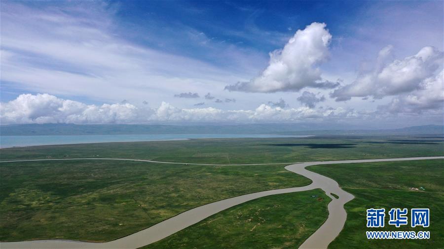7月10日拍摄的青海湖畔风光(无人机照片)。盛夏时节,被誉为“中国最美湖泊”的青海湖畔景色宜人,蓝天、白云、湖水与草原组成一幅壮美的画卷。新华社记者 张宏祥 摄