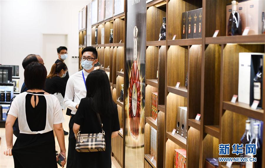 7月12日,游客在海口日月广场免税店选购酒类产品。新华社记者 杨冠宇 摄