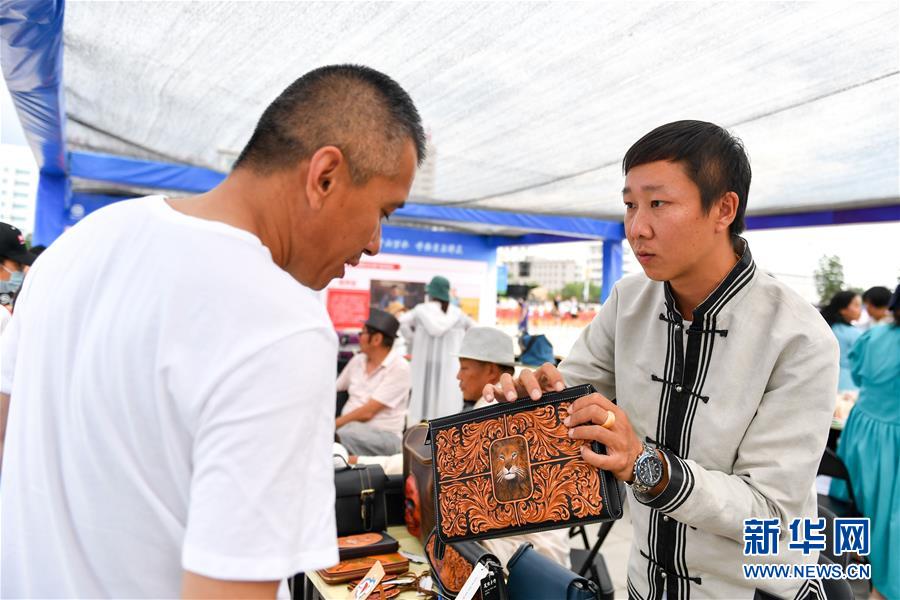 7月12日,在内蒙古呼伦贝尔市海拉尔区惠民展演活动的非遗展区,参展商(右)向游客介绍蒙古族皮雕商品。新华社记者 贝赫 摄