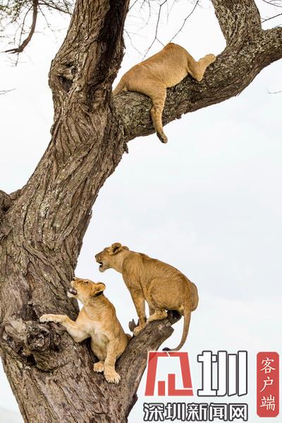 摄影师抓拍狮子上树画面 为争夺位置愤怒咆哮互相攻击