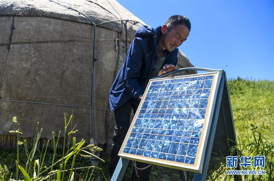 在新疆伊犁特克斯县境内的夏牧场里,一位牧民在毡房外调整太阳能板的摆放位置(7月2日摄)。新华社记者 王菲 摄