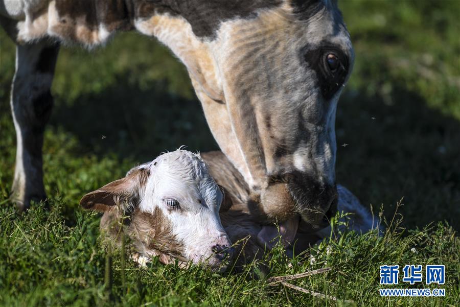 在新疆伊犁特克斯县境内的夏牧场里,母牛在舔舐刚刚出生的牛犊(7月2日摄)。新华社记者 王菲 摄