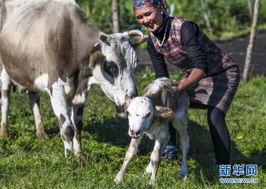 在新疆伊犁特克斯县境内的夏牧场里,一位牧民帮助刚刚出生的牛犊站起来(7月2日摄)。新华社记者 王菲 摄