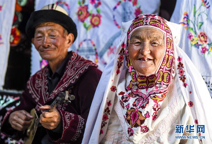 在新疆伊犁特克斯县境内的夏牧场里,两位老人在毡房内弹奏冬不拉唱歌(7月2日摄)。新华社记者 王菲 摄