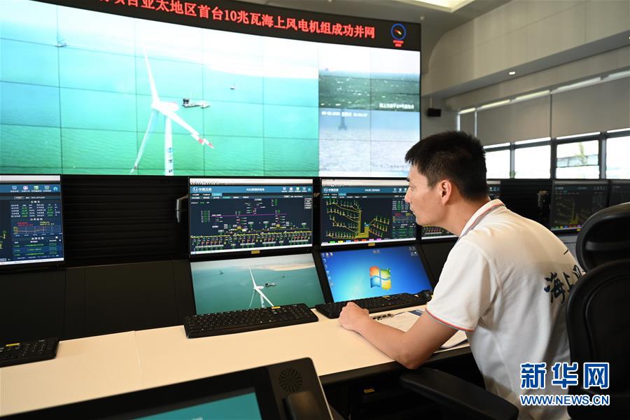 7月12日,三峡福建海上风电集控中心工作人员在调试首台10兆瓦海上风电机组。记者7月13日从三峡集团了解到,国内首台10兆瓦海上风电机组日前在三峡集团福建福清兴化湾二期海上风电场成功并网发电,这是目前我国自主研发的单机容量亚太地区最大、全球第二大的海上风电机组,刷新了我国海上风电单机容量新纪录。新华社记者 林善传 摄