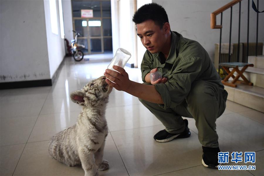 7月13日,动物园工作人员许家兴给“妞妞”喂水。河北石家庄市动物园的孟加拉白虎宝宝“妞妞”只有3个月大,由于虎妈妈经验不足,“妞妞”一出生便由动物园工作人员按科学方法人工饲养。目前,在饲养员的精心照料下,“妞妞”正在茁壮成长。新华社记者 王晓 摄