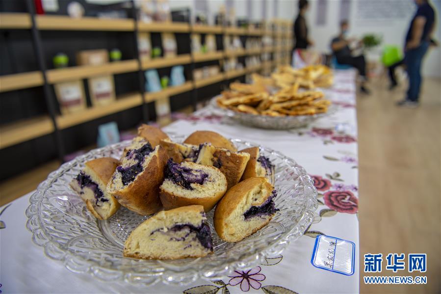 7月13日在新疆精河县精河镇馕文化产业示范基地拍摄的供顾客品尝的“黑枸杞馕”。近日,新疆精河县10万余亩枸杞陆续成熟,当地农民抢抓农时,采收枸杞。近年来,精河县持续发展和培育枸杞“红色产业链”,加大资金扶持力度,提升精河枸杞的品牌效应,带动农民增收致富。精河县位于新疆天山山脉北麓,准噶尔盆地西南边缘。当地日照时间长、昼夜温差大且气候干燥,有利于枸杞果实糖分和药用成分积累。新华社记者 胡虎虎 摄