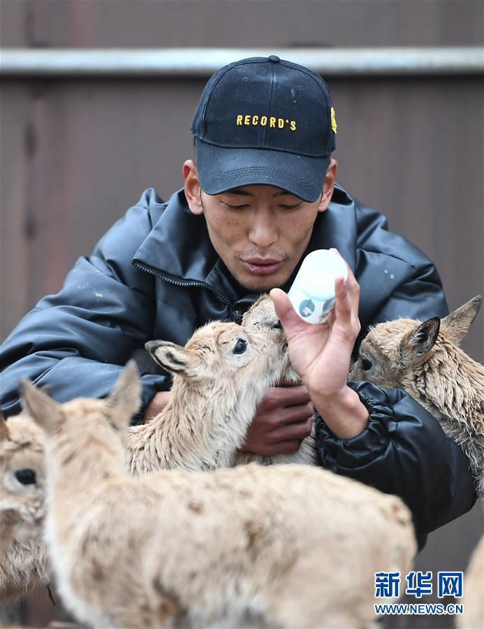 7月8日,三江源国家公园管理局长江源园区可可西里管理处卓乃湖保护站的工作人员才文多杰在给一只藏羚羊幼仔喂奶。新华社记者 张龙 摄