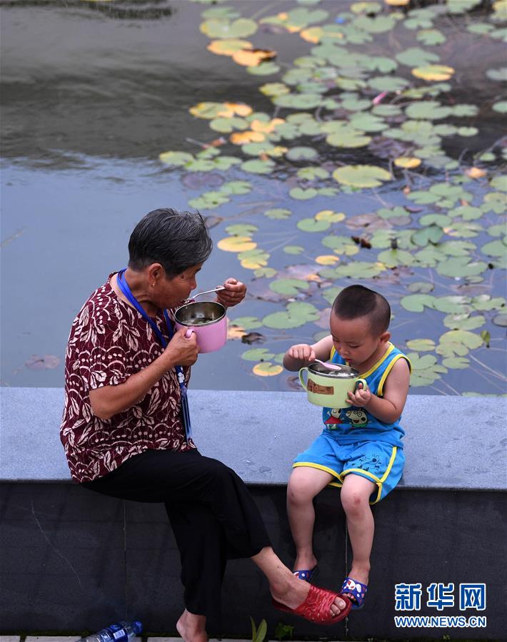 7月14日,在宿松县洲头乡中心小学集中安置点,洲头乡泗洲村的村民在吃晚餐。近日,安徽省宿松县洲头乡泗洲村的300多名村民因洪水被转移到该乡中心小学集中安置点。安置点工作人员、志愿者利用学校食堂为村民们烹饪饭菜,让村民们在安置点吃上热腾腾的三餐。新华社记者 刘军喜 摄