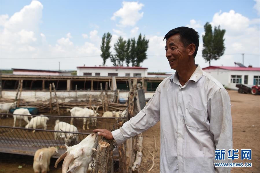 7月14日,高二仁看着自家养的羊露出笑容。新华社记者 李志鹏 摄