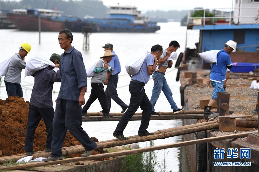 7月14日,当地村民往船只上搬运砂石袋。近日,受洪水影响,安徽省望江县华阳镇境内的江调圩内部道路漫水,抢险车辆无法进入。当地防汛部门组织船只装载砂石袋等防汛物资,运往圩堤保防汛。新华社记者 刘军喜 摄