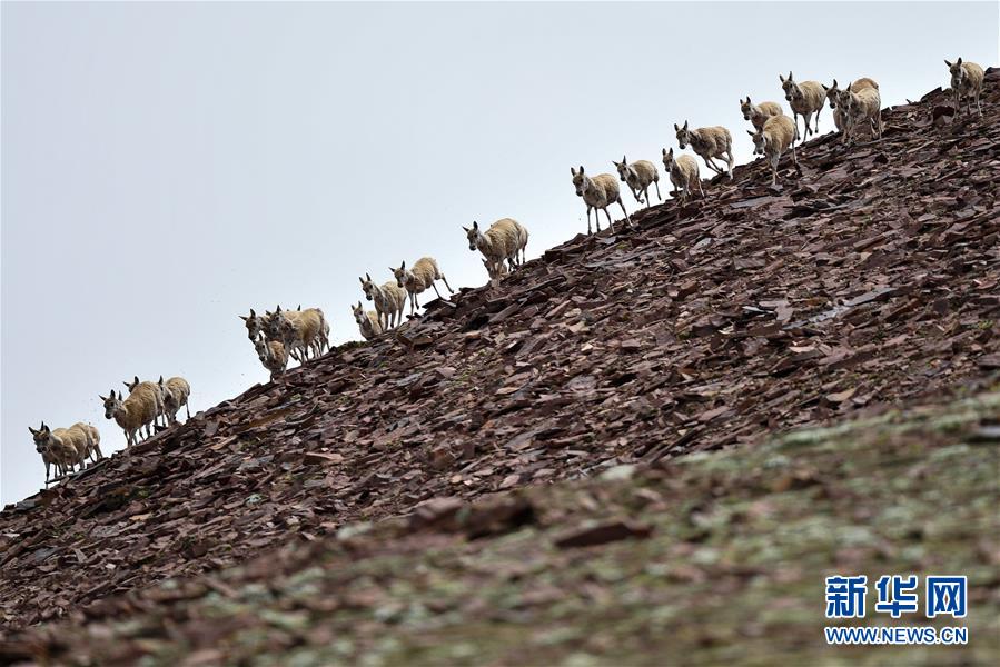 7月7日在可可西里卓乃湖区域拍摄的一群藏羚羊。目前正值藏羚羊产仔季。来自青海三江源、新疆阿尔金山、西藏羌塘等地的藏羚羊来到位于青海省可可西里腹地、被誉为“藏羚羊大产房”的卓乃湖区域产仔。新华社记者 张龙 摄