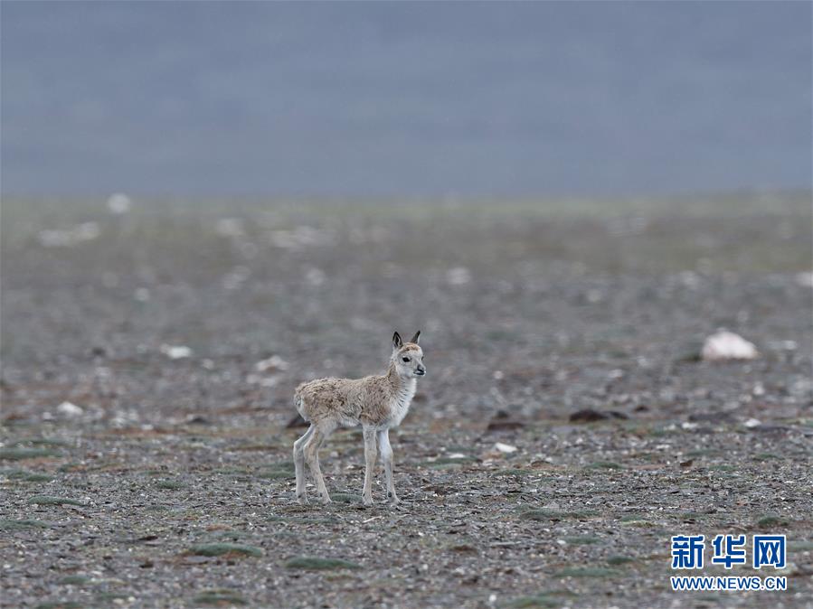 7月7日在可可西里卓乃湖区域拍摄的一只藏羚羊幼仔。目前正值藏羚羊产仔季。来自青海三江源、新疆阿尔金山、西藏羌塘等地的藏羚羊来到位于青海省可可西里腹地、被誉为“藏羚羊大产房”的卓乃湖区域产仔。新华社记者 张龙 摄