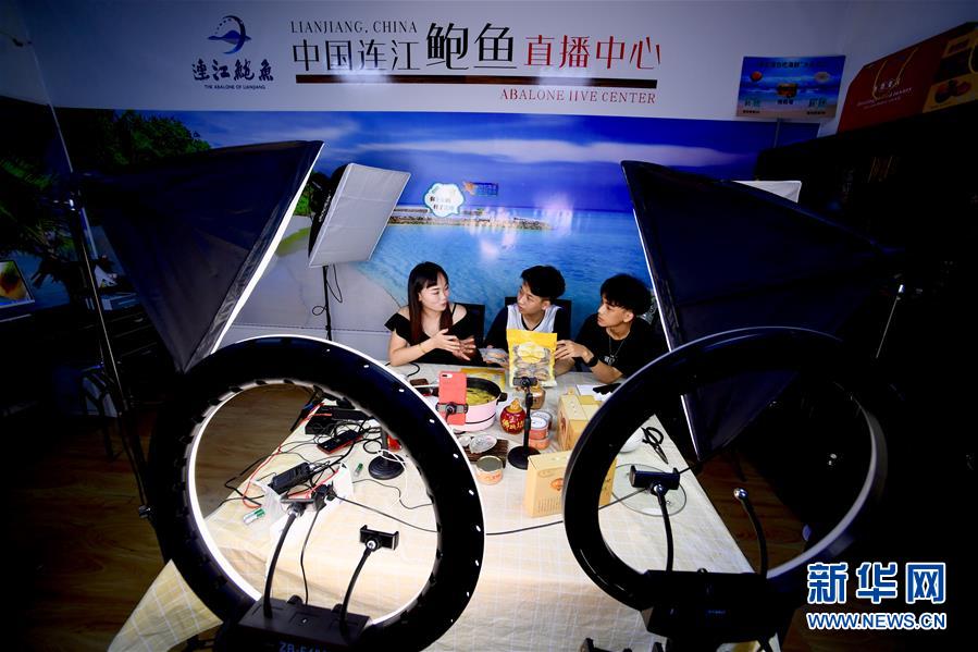 7月14日,在福建省连江县鲍鱼产品直播中心,工作人员在网上直播销售鲍鱼产品。新华社记者 姜克红 摄