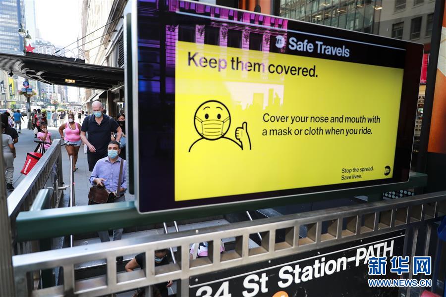 7月14日,人们佩戴口罩进入美国纽约地铁站。美国约翰斯·霍普金斯大学:截至北京时间15日6时34分,全球新冠确诊病例达13258016例,死亡病例为576752例。美国是全球疫情最严重的国家,确诊病例达3416222例,死亡病例为136319例。新华社记者 王迎 摄